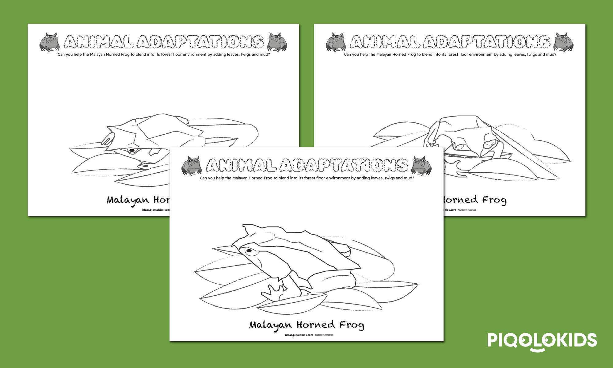 3 x Malayan Horned Frog Camouflage Colouring Sheets