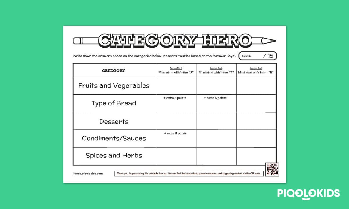 This printable pack consists of 1 printable worksheet which contains 5 different rows of categories against 3 different columns of "answer keys". The objective of the challenge is complete all 15 answer boxes.