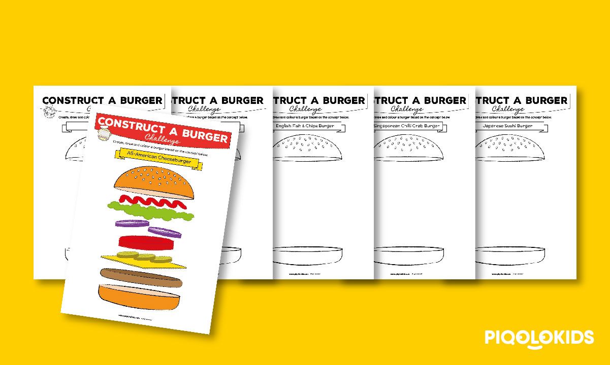 This printable pack consists of 4 drawing and colouring worksheets with different cuisine prompts to design your fusion burgers. It also consists of 1 complete classic cheeseburger example and 1 sheet which is open-ended and can be used for any cuisine you or your child can think of.