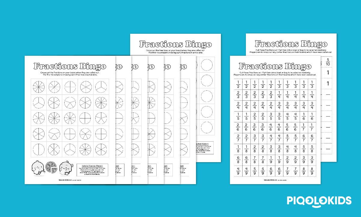 This printable pack consists of 9 printable worksheets for your child to play the fractions bingo game: