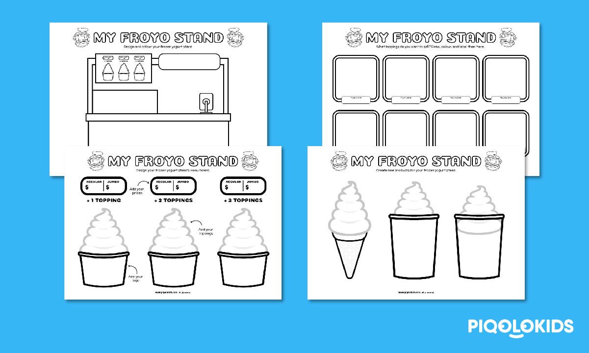 This printable pack consists of 4 printable worksheets to design your own frozen yogurt stand. It includes: