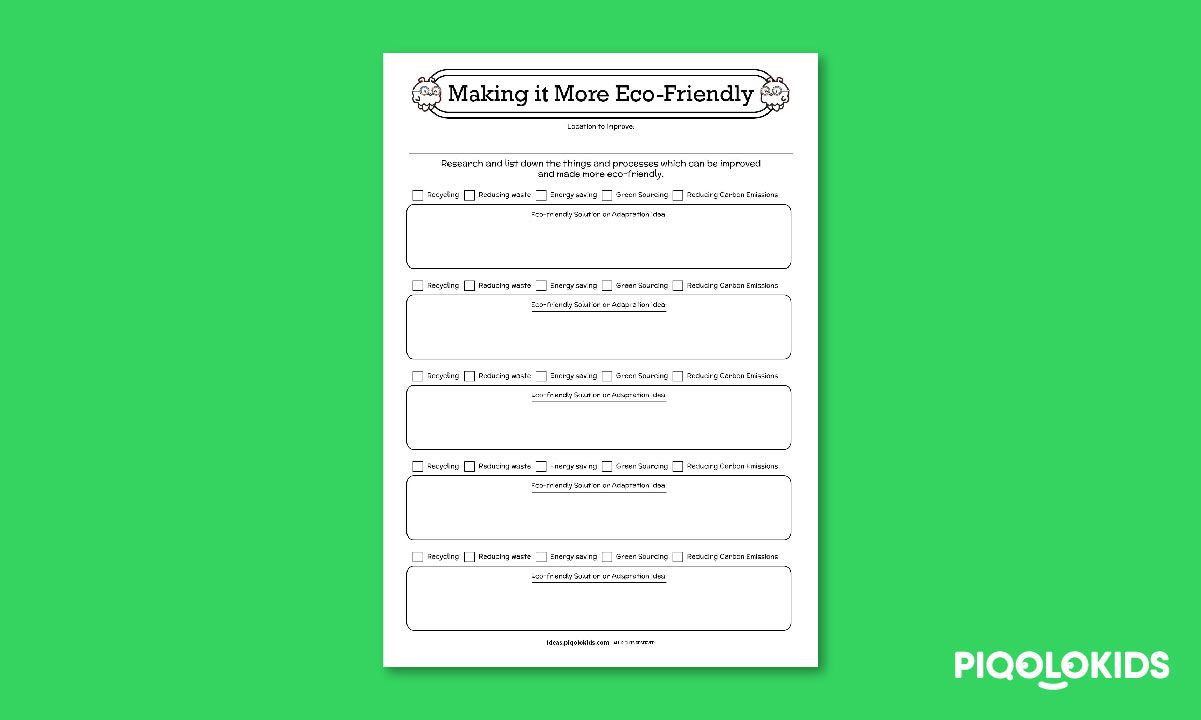This printable pack consists of a printable challenge worksheets for your child or student to research, reflect and record ideas on how to make a space (home, classroom or school) more sustainable.