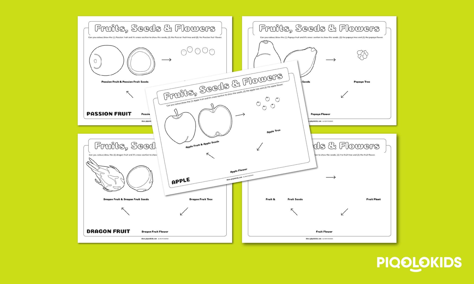 4 Different Fruit, Seeds and Flower Research and Colouring Sheet