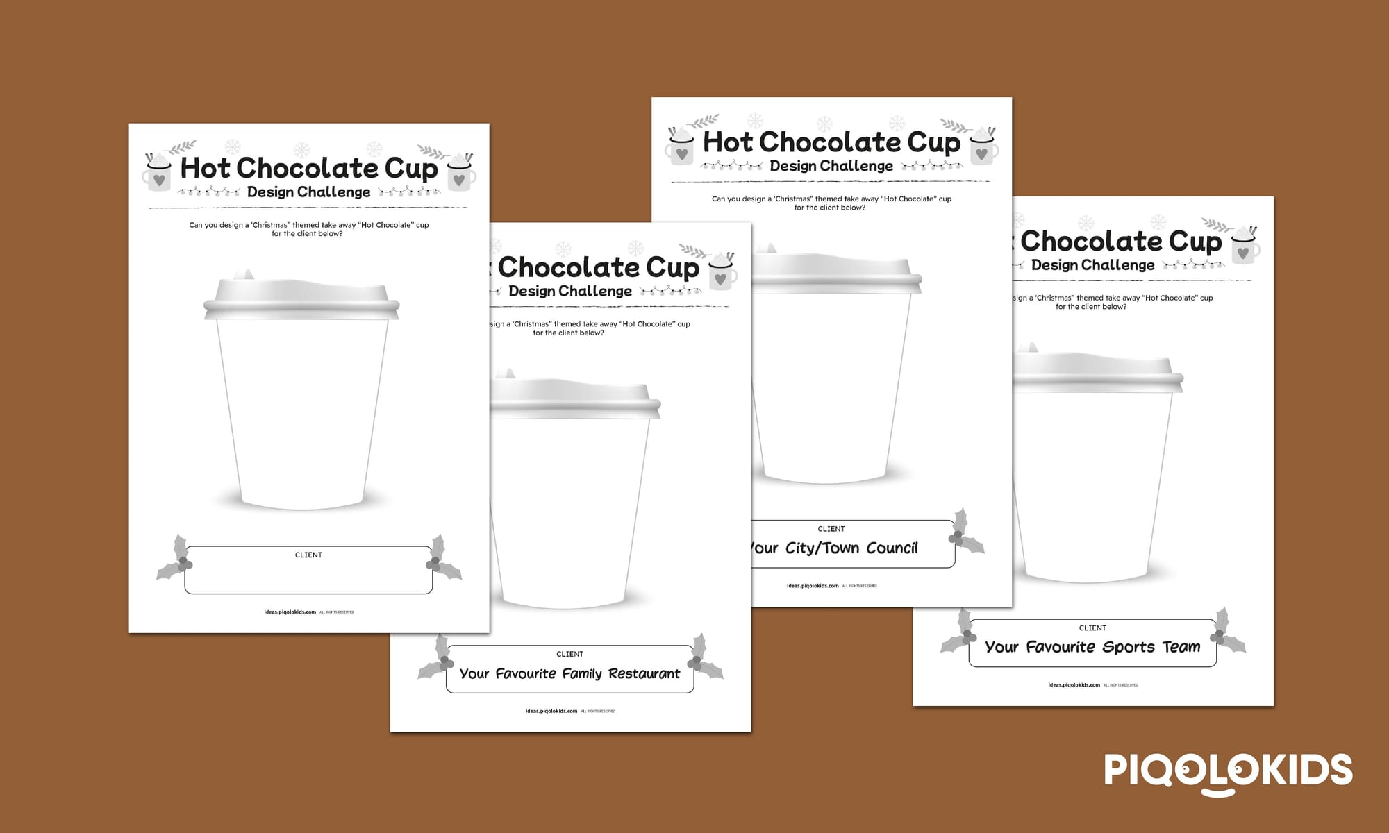 In this printable activity, your students will have the opportunity to design "Christmas Edition" hot chocolate cups for local organizations in their community. They will use their creativity to decorate cups with festive themes, such as holiday lights, winter scenes, and cheerful snowmen.