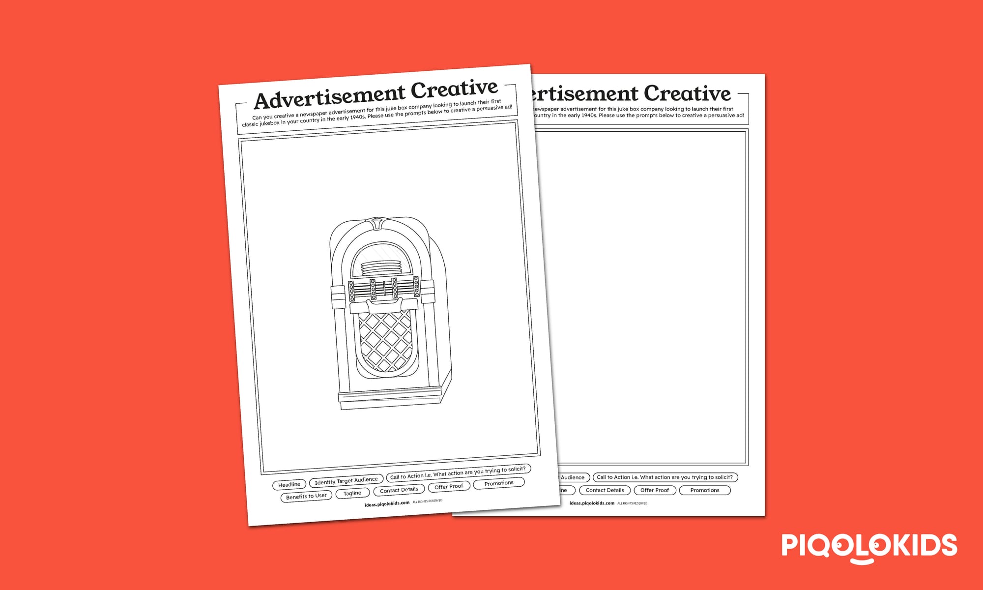 In this printable activity, elementary students will create a persuasive advertisement for a jukebox from the 1940s. They will use their research, artistic and writing skills to make a colourful, catchy, and imaginative ad, showcasing the jukebox as a must-have item of the era.