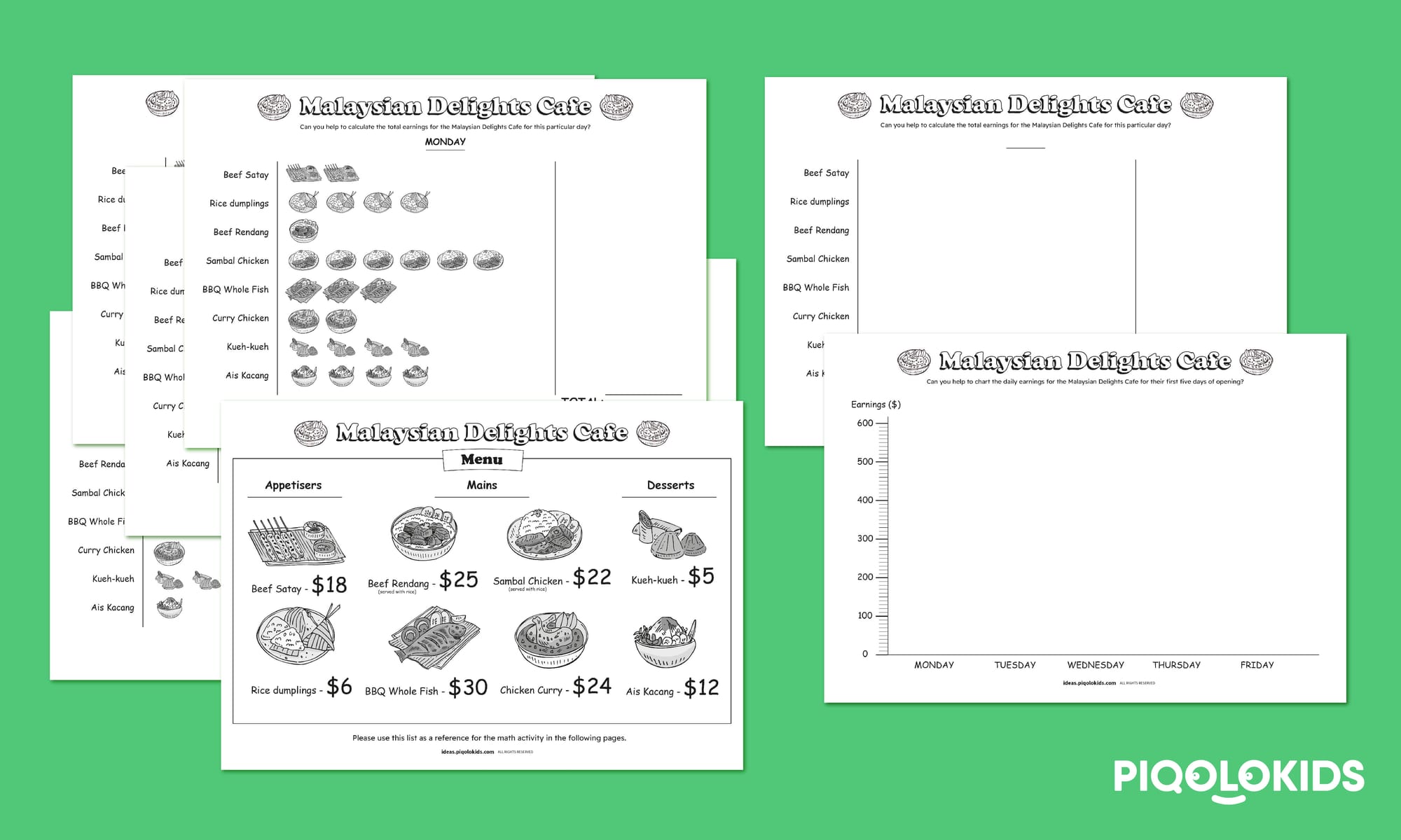 5 Malaysian Restaurant math (addition/multiplication) exercise sheets