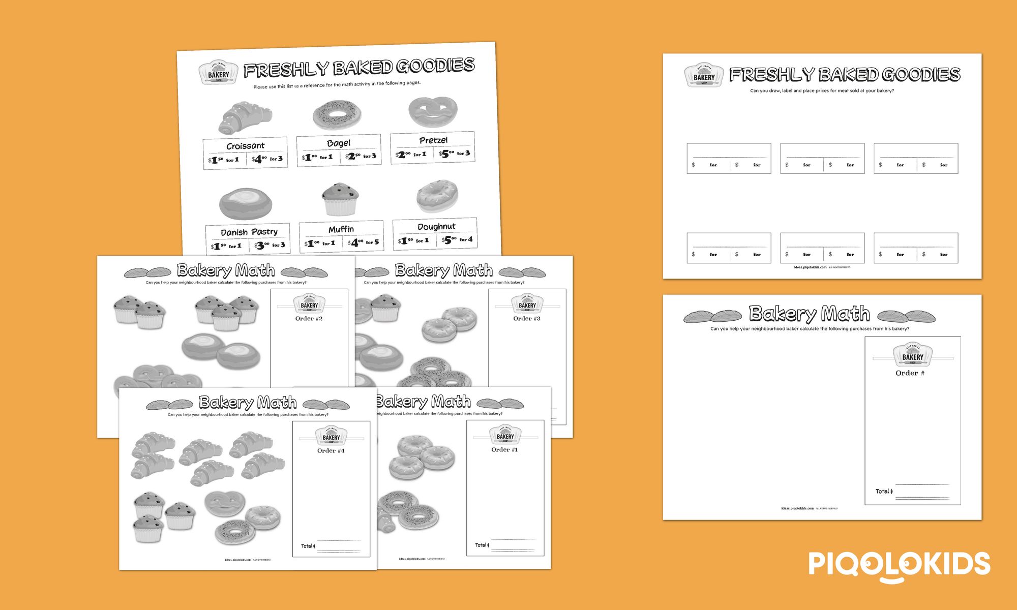 4 Bakery math (addition) exercise (1 math questions on each sheet) sheets