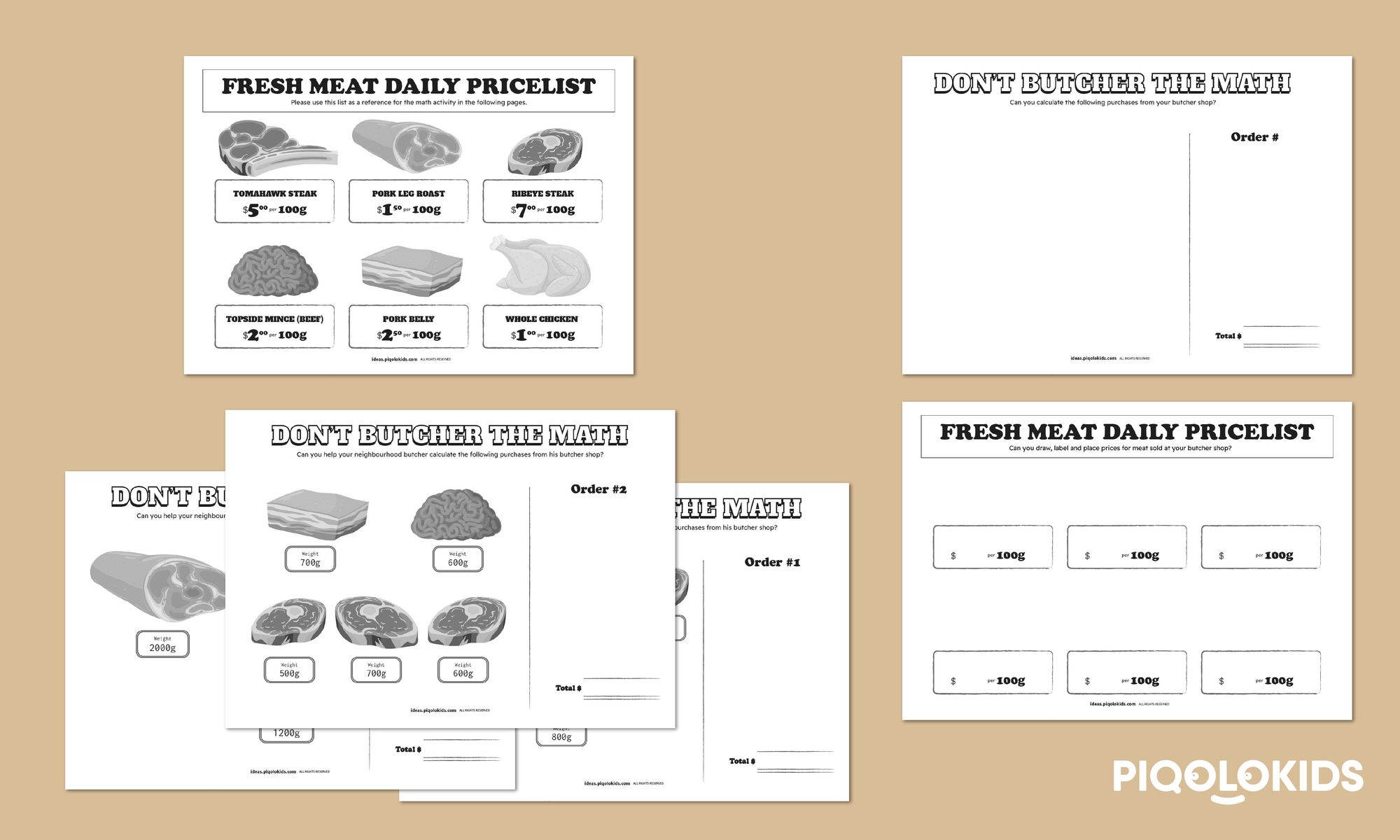 3 Butcher Shop math (multiplication) exercise (1 math questions on each sheet) sheets