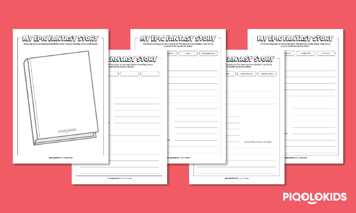 This printable pack consists of 5 printable worksheet s to help your child start writing his or her first fantasy story. There are 3 worksheet s with different prompt words to incorporate into their story. There is also 1 open ended writing worksheet and also a worksheet for them to design and decorate their story book cover.
