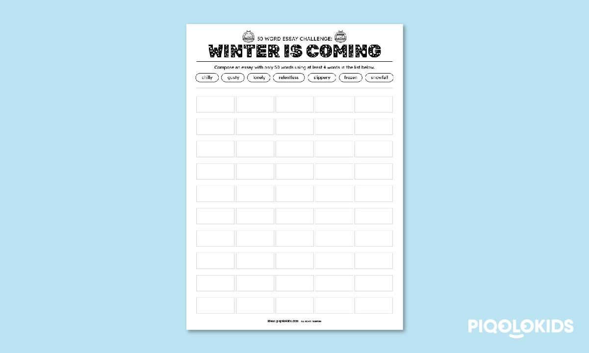 This printable pack consists of a printable design challenge worksheet. It is a 50 word essay template with 7 winter-related descriptive words. Let's get creative!