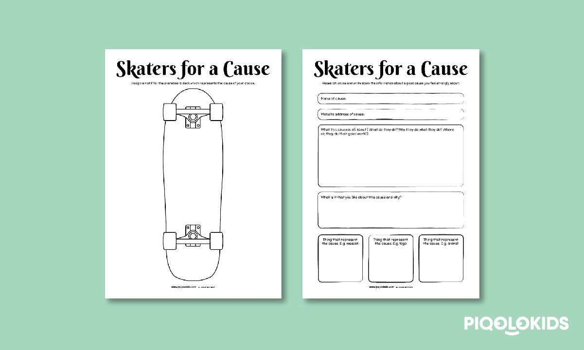 This printable pack consists of 2 printable activity worksheets. One worksheet is to gather and journal information about the charitable or good cause your child has selected. The second worksheet is a skateboard deck design sheet.