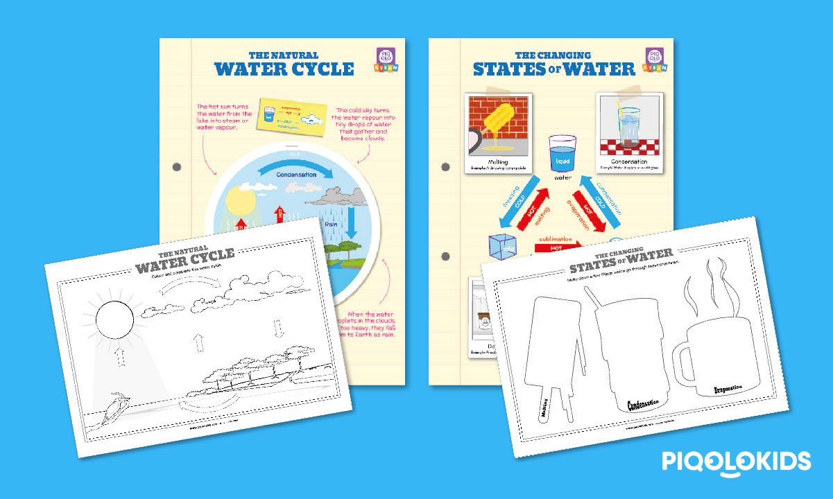 This printable pack consists of 2 printable activity worksheets about water cycles and the changing states of water. It also includes 2 "infographic" sheets with related flow charts.