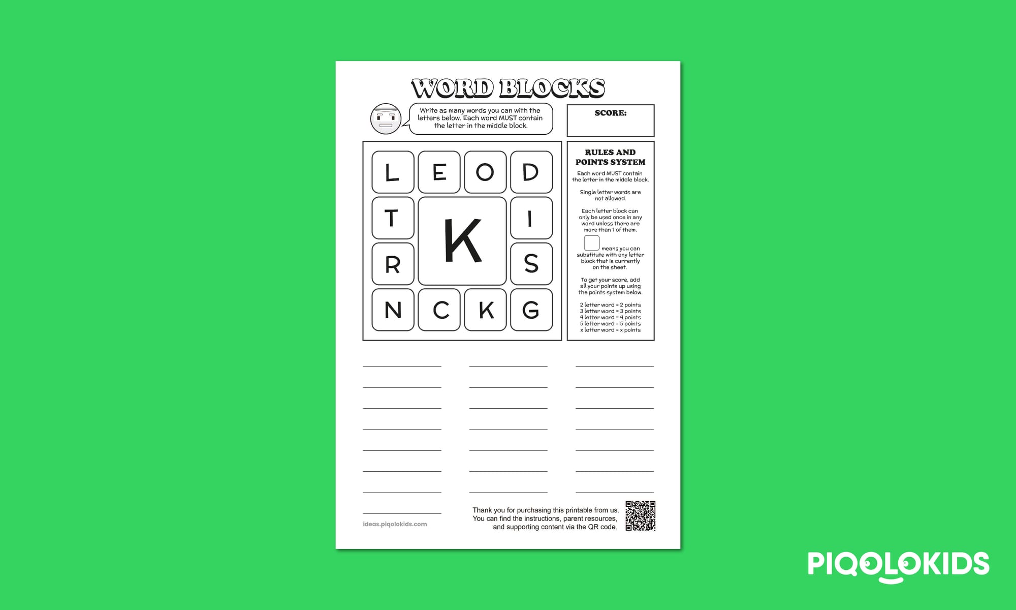 This printable pack consists of 1 printable worksheet which contains a set of letters which can be used to form English words. The objective of the challenge is to list down as many words as possible.
