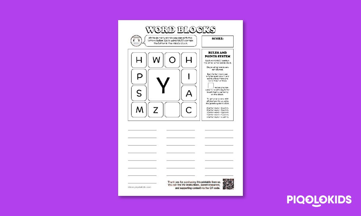 This printable pack consists of 1 printable worksheet which contains a set of letters which can be used to form English words. The objective of the challenge is to list down as many words as possible.