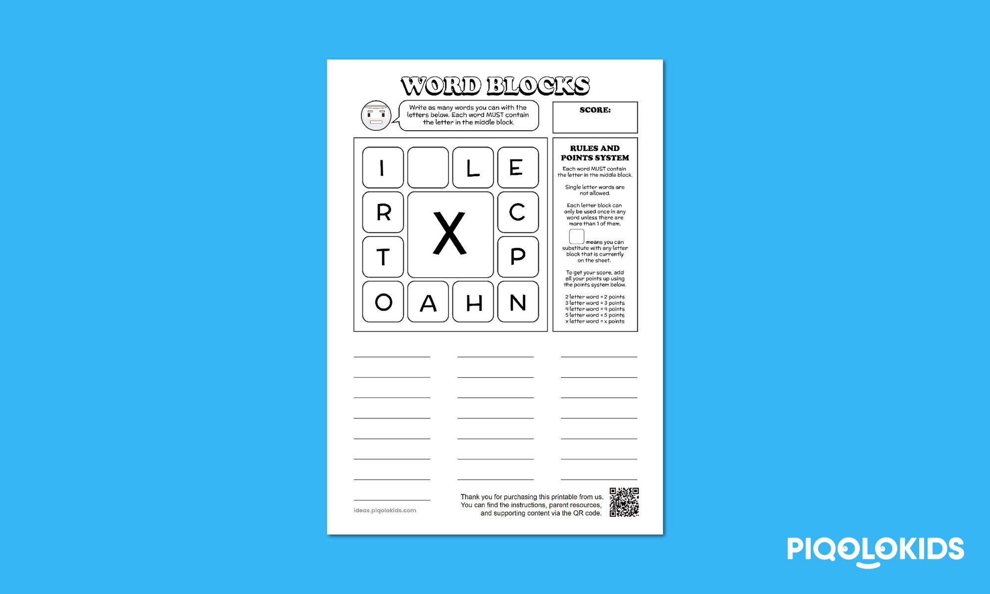 This printable pack consists of 1 printable worksheet which contains a set of letters which can be used to form English words. The objective of the challenge is to list down as many words as possible.