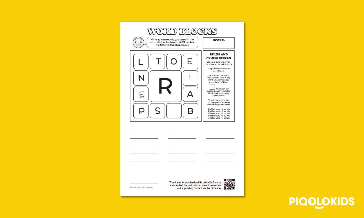 This printable pack consists of 1 printable worksheet which contains a set of letters which can be used to form English words. The objective of the challenge is to list down as many words as possible.