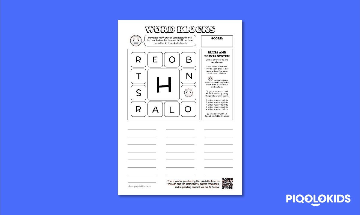 This printable pack consists of 1 printable worksheet which contains a set of letters which can be used to form English words. The objective of the challenge is to list down as many words as possible.