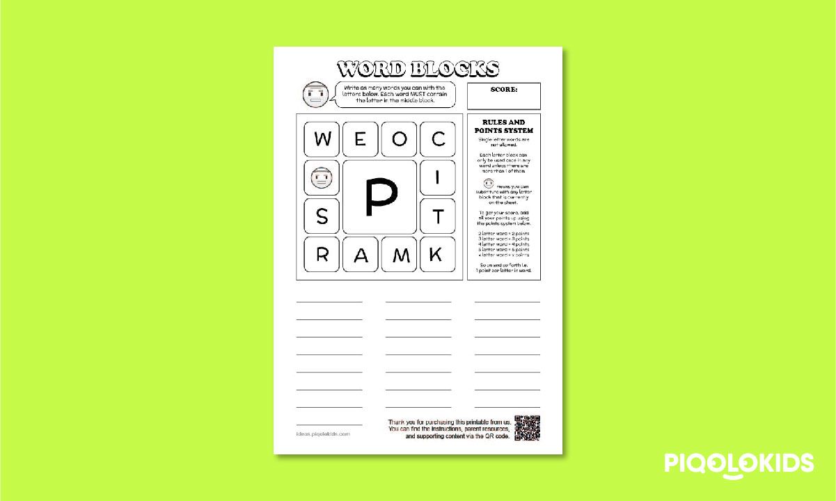 This printable pack consists of 1 printable worksheet which contains a set of letters which can be used to form English words. The objective of the challenge is to list down as many words as possible.