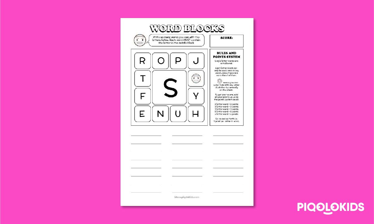 This printable pack consists of 1 printable worksheet which contains a set of letters which can be used to form English words. The objective of the challenge is to list down as many words as possible.