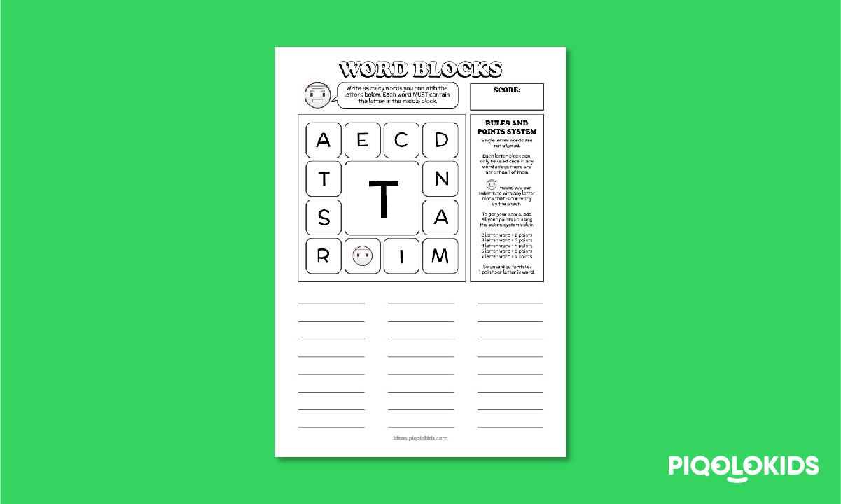 This printable pack consists of 1 printable worksheet which contains a set of letters which can be used to form English words. The objective of the challenge is to list down as many words as possible.