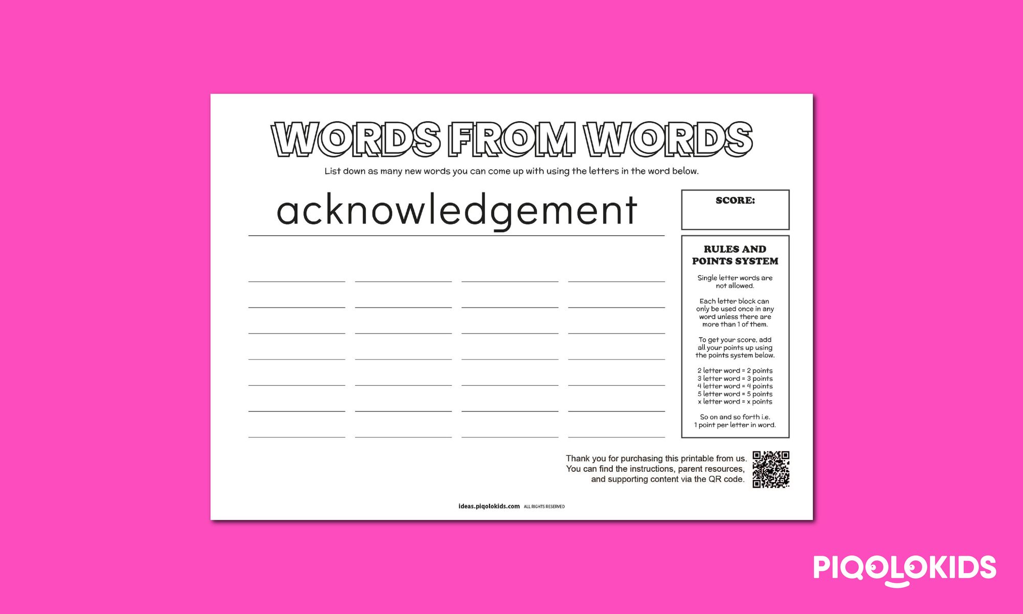 In this activity, your child will list down as many new words from the letters of an existing word in the printable worksheet.