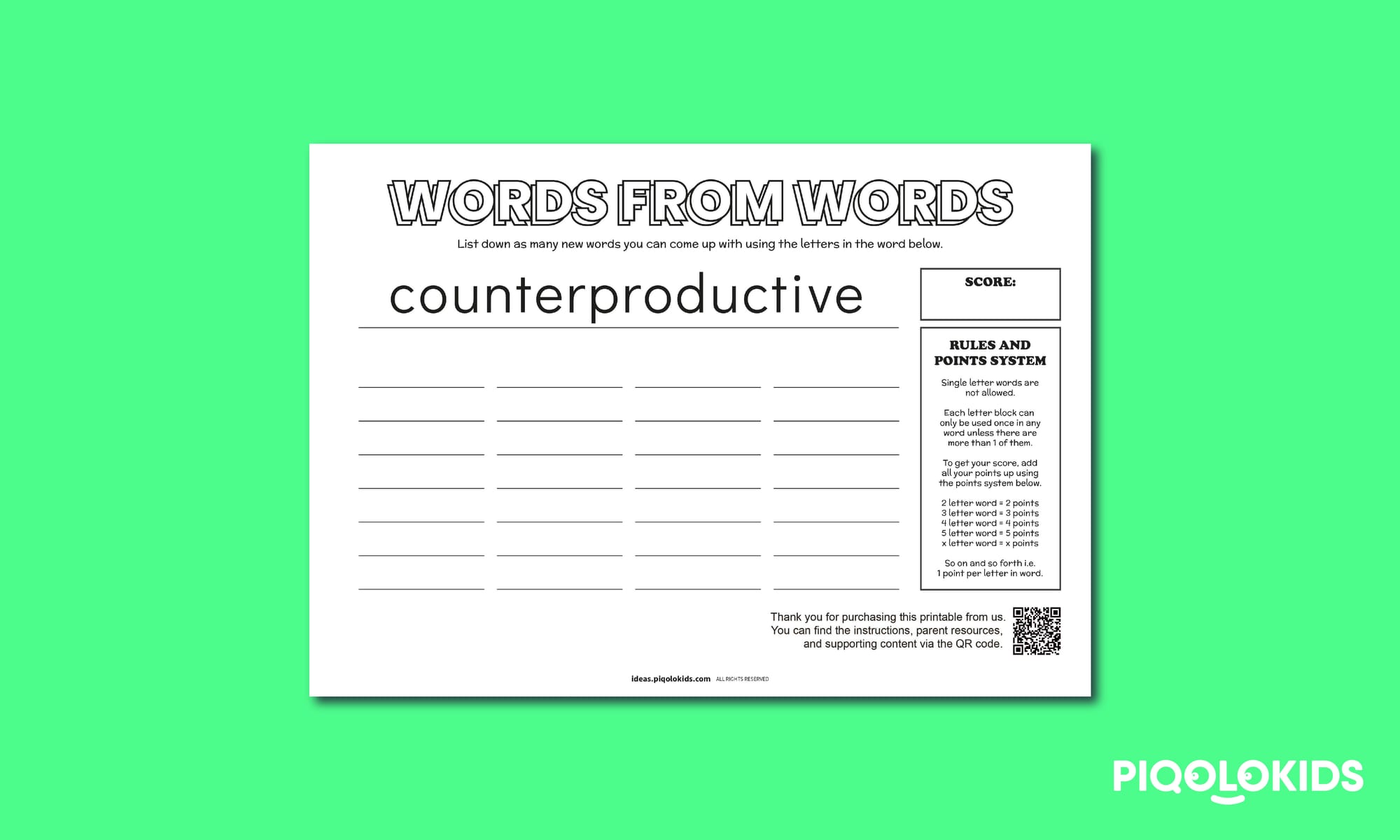 This printable pack consists of 1 printable worksheet which contains a long English word which can be used to form new words. The objective of the challenge is to list down as many words as possible.