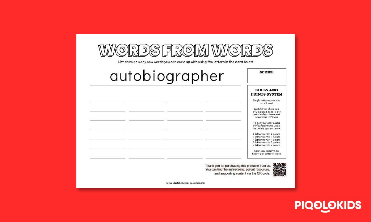 In this activity, your child will list down as many new words from the letters of an existing word in the printable worksheet.